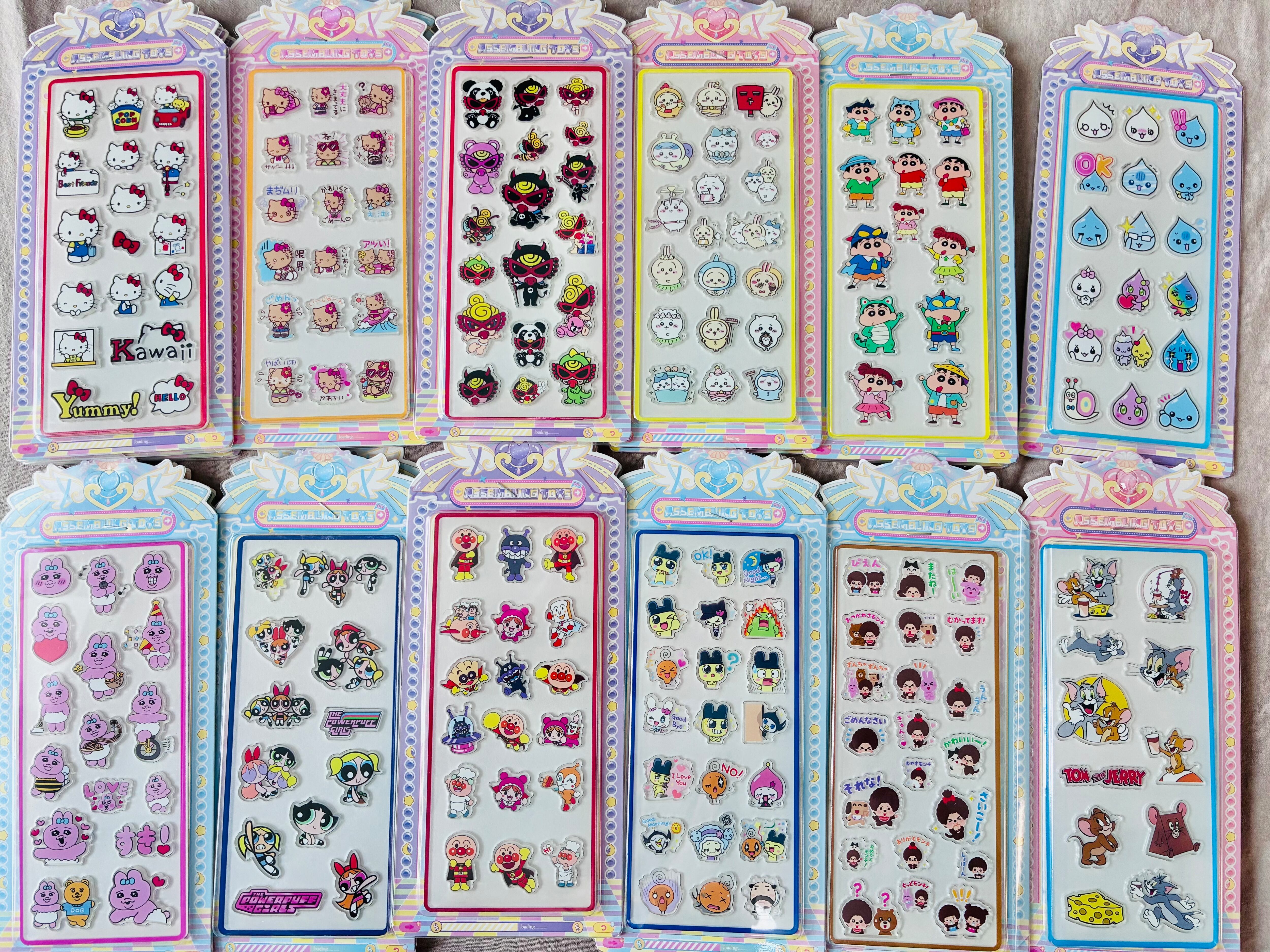 しずくちゃん、たまごっち、おぱんちゅ、アンパン、日焼けキティなど、様々なキャラクターのシールがあります。